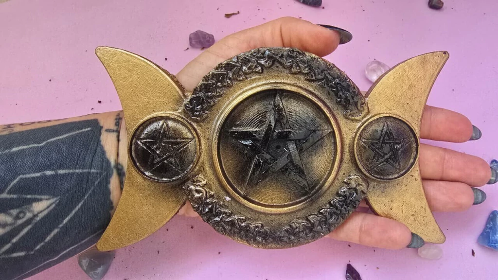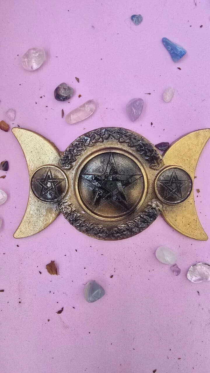 O Incensário Triluna é uma peça sagrada que carrega a energia da Deusa Tripla – Donzela, Mãe e Anciã –, representando os ciclos da vida, as fases da lua e a sabedoria feminina.